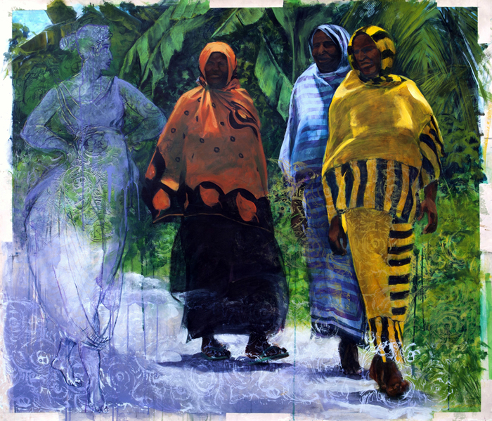 In creating his compositions, Leamon Green gathers a number of source photos that capture many cultural and global references. This collection allows him to infuse his works with contemporary and historical topics that coalesce around the concept of identity. By alluding to these varying, yet familiar objects, patterns, and situations, Green’s intention is for the audience to identify with the subject and recognize the difficulty in defining identity as one specific thing.